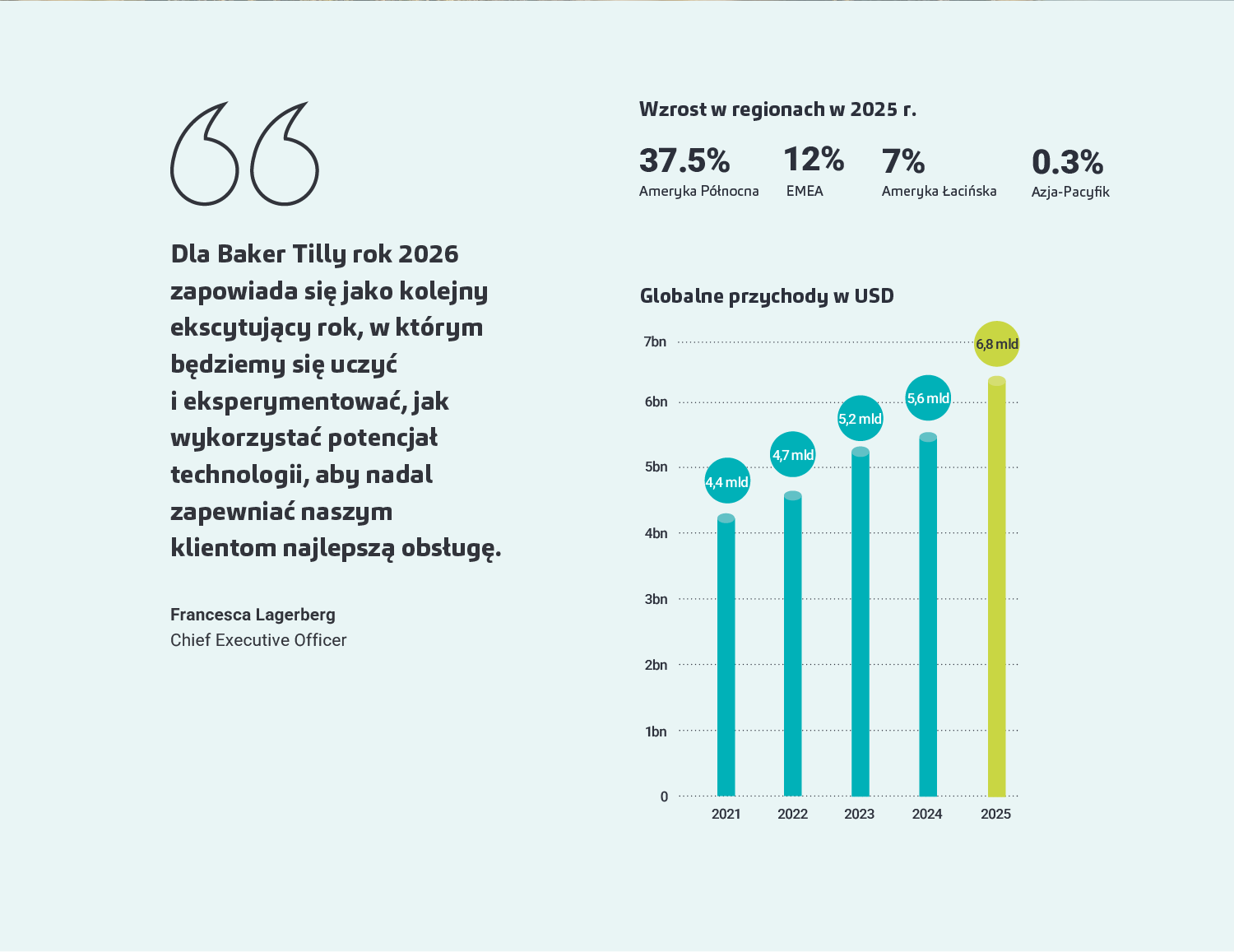 Jak podsumowuje Francesca Lagerberg, CEO Baker Tilly International: „Organiczny i nieorganiczny wzrost przychodów we wszystkich naszych regionach to niezwykłe osiągnięcie, biorąc pod uwagę wyzwania, z jakimi mierzył się rynek usług profesjonalnych w ciągu ostatnich 12 miesięcy. To był intensywny rok dla zawodu księgowego i nie było inaczej w naszej sieci – w 2025 r. doszło do szeregu inwestycji private equity oraz wielu ekscytujących fuzji. Cenimy połączenie wzrostu organicznego i nieorganicznego."