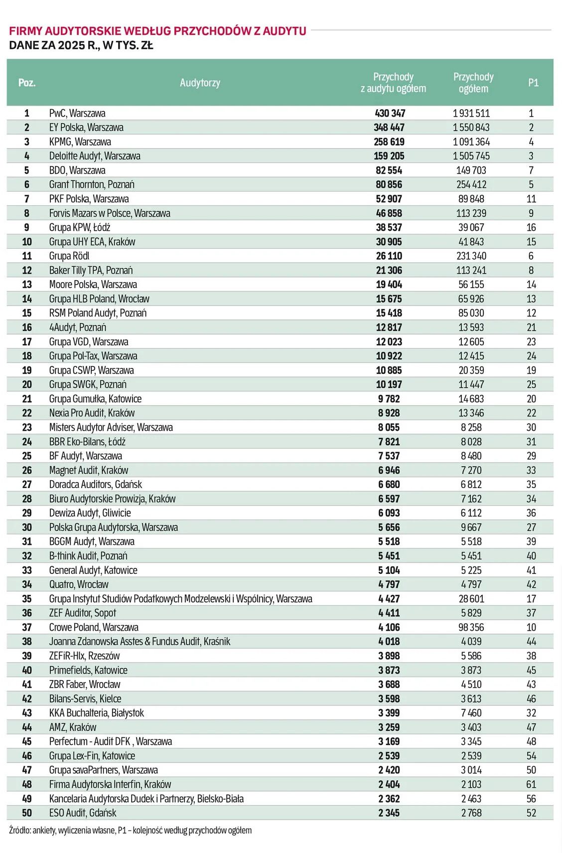 Zajmując 12. miejsce w kategorii przychodów z audytu oraz 8. miejsce pod względem ogólnych przychodów, a także 10. miejsce pod względem zatrudnienia ogółem, pozostajemy kolejny rok wśród czołowych podmiotów branży. Tegoroczny wynik jest dla Baker Tilly TPA ważnym punktem odniesienia w ocenie pozycji firmy na rynku audytu w Polsce.
