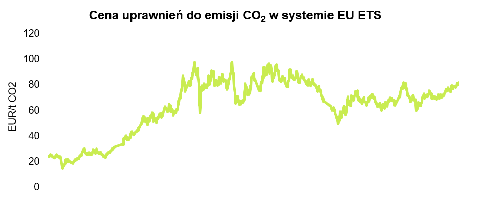 • Zaostrzenie EU ETS (Europejskiego Systemu Handlu Emisjami). Ceny EU ETS gwałtownie wzrosły do 80–90 €/t w 2021–22, co mocno uderzyło w koszty spółek opartych na węglu. Ponadto, od połowy 2025 r. źródła emitujące powyżej 550 g CO₂/kWh nie kwalifikują się do wsparcia na rynku mocy.